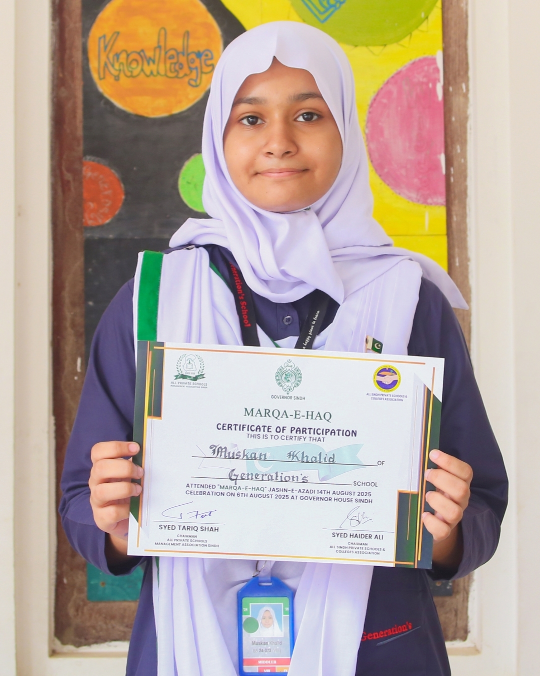 Muskan Khalid (XI-G) represented Generation’s at Governor’s House with a meaningful poster themed “Maarka-e-Haq: Jashn-e-Azaadi.”